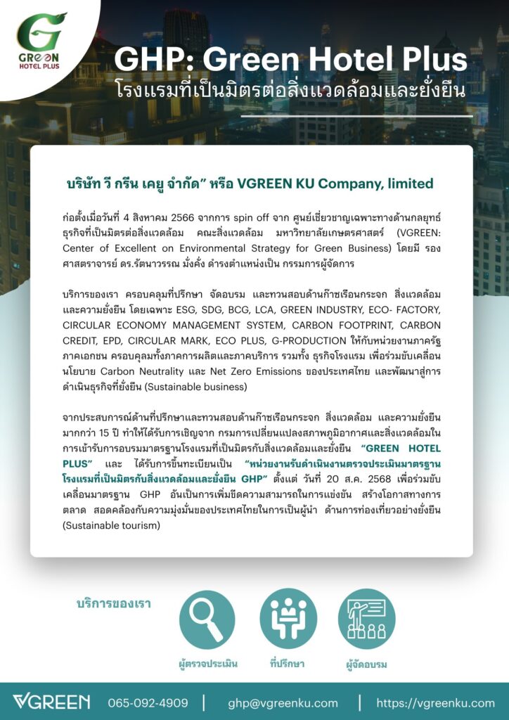 บริษัท วี กรีน เคยู จำกัด ได้รับการเชิญจาก กรมการเปลี่ยนแปลงสภาพภูมิอากาศและสิ่งแวดล้อม ในการเข้ารับการอบรมมาตรฐานโรงแรมที่เป็นมิตรกับสิ่งแวดล้อมและยั่งยืน “GREEN HOTEL PLUS” และ ได้รับการขึ้นทะเบียนเป็น “หน่วยงานรับดำเนินงานตรวจประเมินมาตรฐานโรงแรมที่เป็นมิตรกับสิ่งแวดล้อมและยั่งยืน GHP” ตั้งแต่ วันที่ 20 ส.ค. 2568 เพื่อร่วมขับเคลื่อนมาตรฐาน GHP อันเป็นการเพิ่มขีดความสามารถในการแข่งขัน สร้างโอกาสทางการตลาด สอดคล้องกับความมุ่งมั่นของประเทศไทยในการเป็นผู้นำ ด้านการท่องเที่ยวอย่างยั่งยืน (Sustainable tourism)