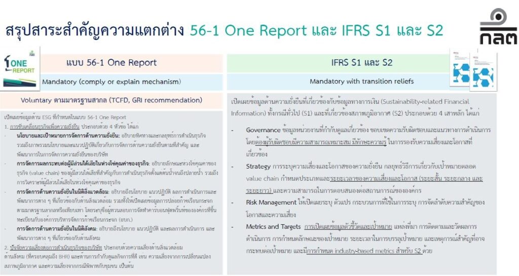 กลต. อยู่ในระหว่างการปรับปรุง ONE REPORT เป็น ONE REPORT-S (S มาจาก IFRS S1 & IFRS S2) คาดว่าจะประกาศใช้อย่างเป็นทางการในปี 2570 โดย กลต. ได้ทำการเปรียบเทียบให้เห็นอย่างชัดเจนว่า ONE REPORT กับ IFRS S1 & IFRS S2 (ดังรูปที่แสดงด้านล่าง) ว่ามีเนื้อหาสอดคล้องและเป็นไปในทิศทางเดียวกัน